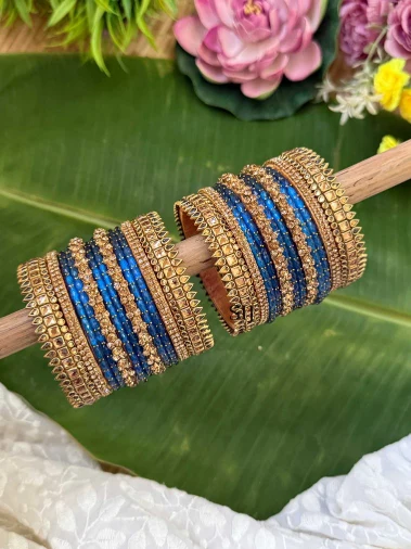 दुल्हनों के लिए ग्लास बैंगल्स का अलग ही क्रेज होता है। ब्राइडल ग्लास बैंगल्स में आपको रेड, मैरून, ग्रीन और गोल्डन शेड्स में बेहतरीन सेट मिलते हैं। इन बैंगल्स को स्टोन, कुंदन और मेटल बैंगल्स के साथ मिलाकर एक शानदार bridal set तैयार किया जाता है। शादी के दिन यह हाथों को भरा हुआ और रॉयल लुक देता है।