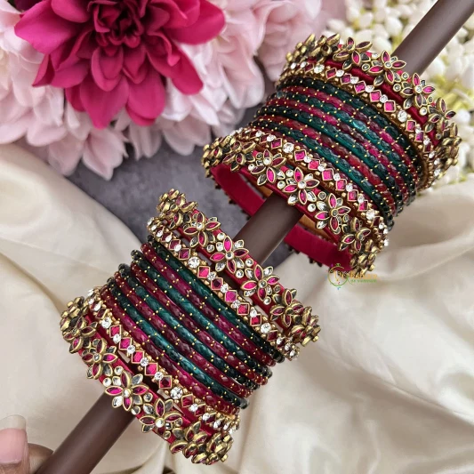 स्टोन वर्क वाली कांच की चूड़ियां मॉडर्न और ट्रेडिशनल दोनों लुक के लिए परफेक्ट हैं। इन बैंगल्स में रंग-बिरंगे स्टोन, मोती और छोटे बीड्स का काम किया जाता है जो हाथों में चमक और खास स्टाइल लेकर आता है। पार्टी और रिसेप्शन के लिए यह एक बेहतरीन विकल्प है।